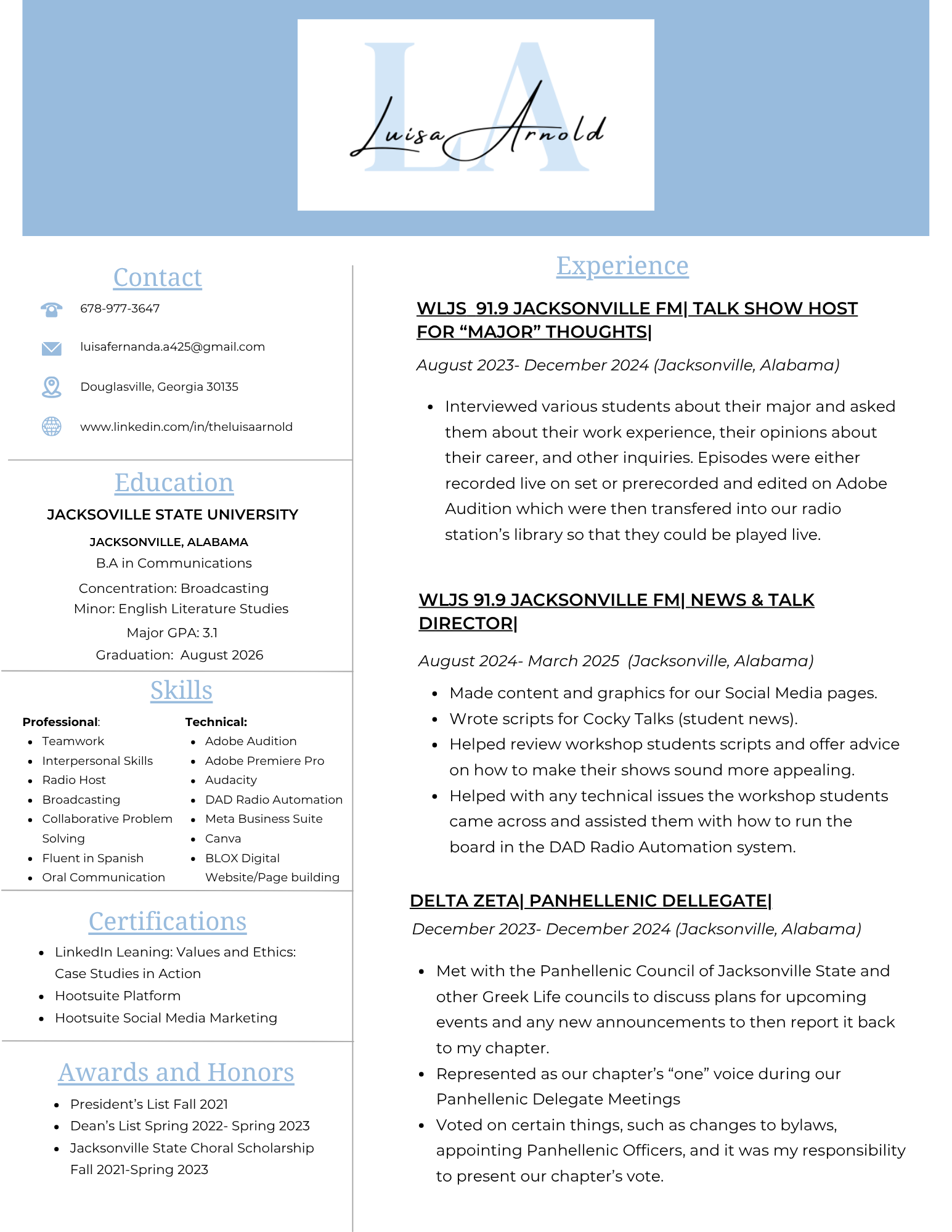 Are you currently in search for a media talent for Radio or for Broadcast Television? Download Luisa’s Resume to find out if she is the perfect fit.